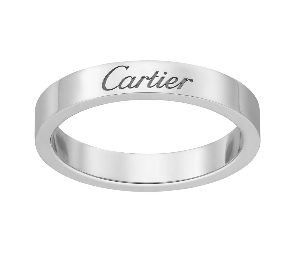 程よい太さがあり、単品でも存在感のあるリング。潔くシンプルだから男性もカジュアルに着けやすく、モダンな印象のエフォートレスなリング。ウェディングリング「C ドゥ カルティエ」(プラチナ)¥280,500