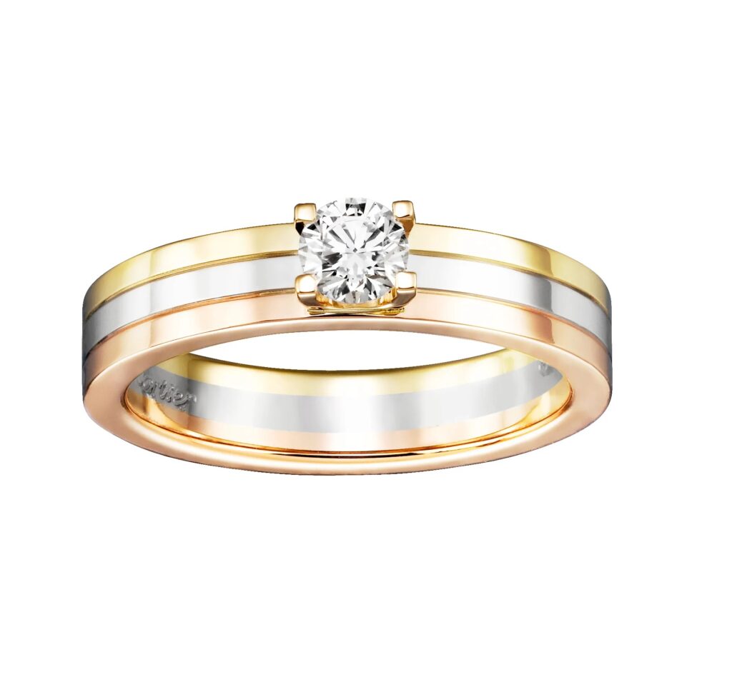 3カラーゴールドのリングの中央にダイヤモンドが輝くソリテールリング。3カラーゴールドが使われているので、同じコレクションのマリッジリングだけでなく、どのリングとも合わせすい点が魅力。リング「ルイ カルティエ ヴァンドーム」(ホワイトゴールド×イエローゴールド×ピンクゴールド×ダイヤモンド)0.23ct~ ¥557,040~