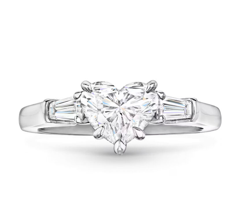 プラチナ製バンドにセッティングされたハートシェイプ・ダイヤモンドの脇に、2石のテーパード・バゲットカット・ダイヤモンドが配され、センターストーンの輝きと存在感をを引き立てているクラシカルなリング。ハートの甘さとテーパード・バゲットカットのクールシックな表情のコントラストが絶妙。エンゲージメントリング「ハートシェイプ・クラシック・リング」(プラチナ×ダイヤモンド)1.00ct~¥4,400,000台中心