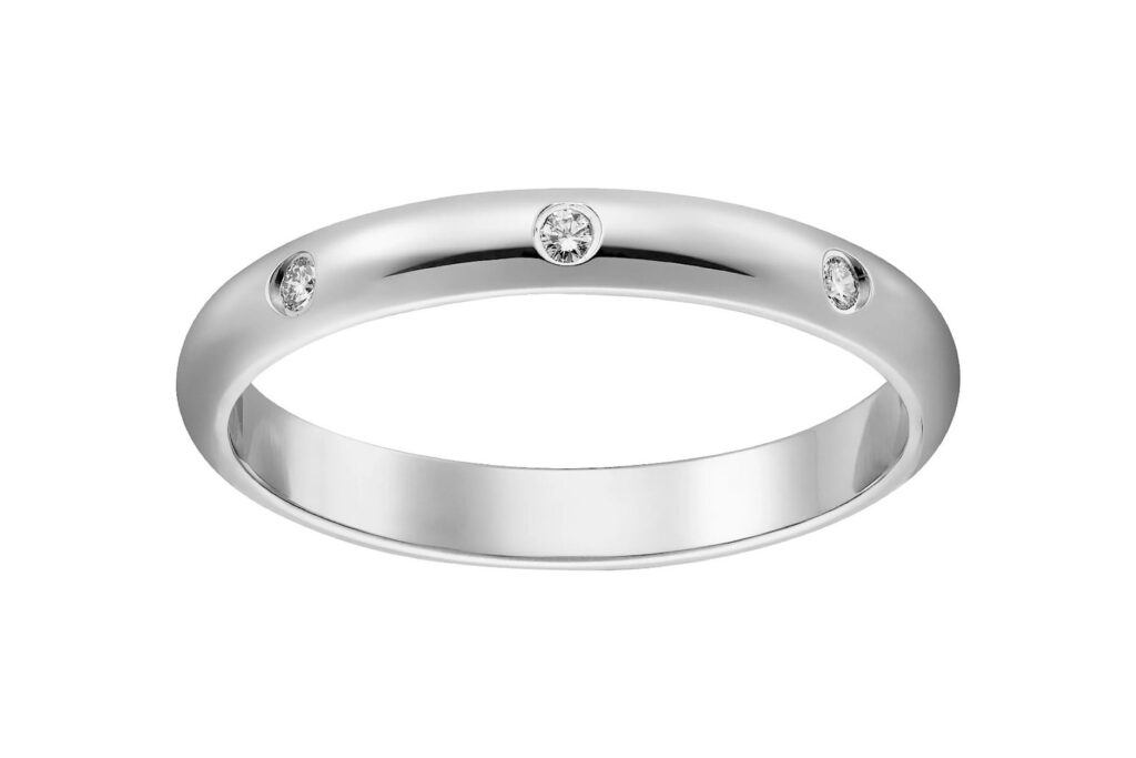 小粒のダイヤモンドが3石配されたシンプルなリング。どんなエンゲージメントリングとも、手持ちのリングとも合わせやすい控えめな主張が魅力。ウェディングリング「1895」 (プラチナ×ダイヤモンド)¥268,400