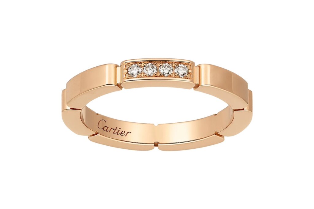 メゾンを象徴する動物、パンテール(豹)の名を冠したコレクションのマリッジリング。しなやかなフラットリンクのチェーンの一部に、4石のダイヤモンドが配されています。重ねるのはもちろん、1本でも楽しめる存在感が魅力。ウェディング リング「マイヨン パンテール」(ピンクゴールド×ダイヤモンド)¥320,100