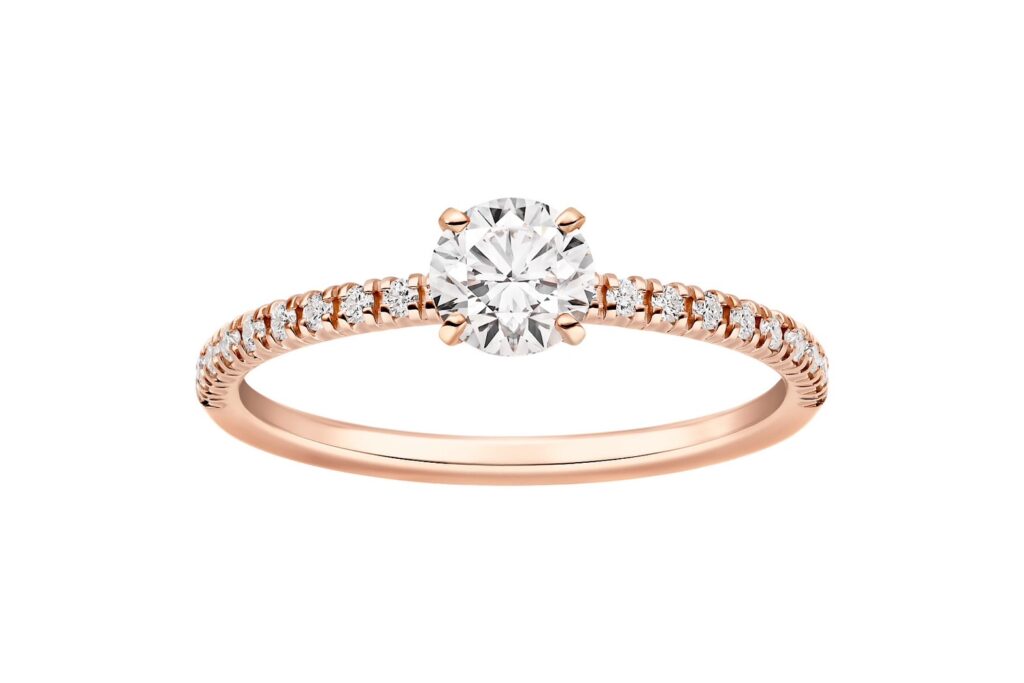 メレダイヤモンドがセッティングされたアームの中央にセンターストーンが煌めくソリテールリング。華奢で優美なデザインとピンクゴールドの柔らかな輝きが融合し、手元をピュアなオーラで包み込みます。リング「エタンセル ドゥ カルティエ」(ピンクゴールド×ダイヤモンド)0.18ct~ ¥392,150~
