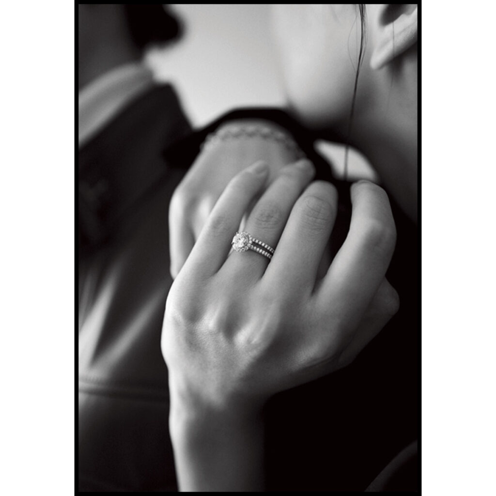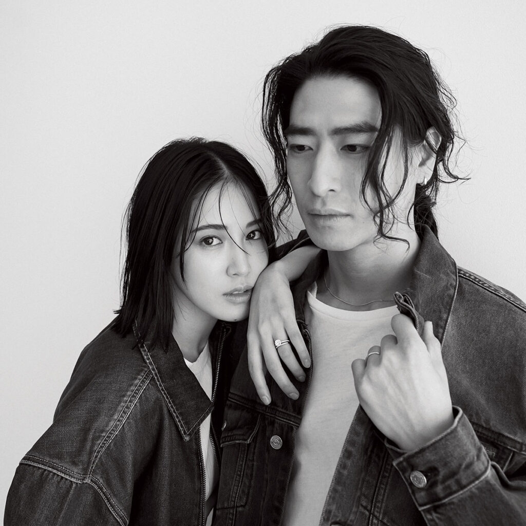 リングは私物。YUさんがサプライズで贈ったというエンゲージと、ふたりで選んだマリッジ。どちらもハリー・ウィンストン。【KAREN】ブルーデニムブルゾン¥30,800ブルーデニムパンツ¥33,000(ともにカルバンクライン ジーンズ)Tシャツ/スタイリスト私物ジュエリー/すべて本人私物【YU】ブラックデニムジャケット¥38,500ブラックデニムパンツ¥27,500(ともにカルバンクライン ジーンズ)ホワイトTシャツ/スタイリスト私物ジュエリー/すべて本人私物