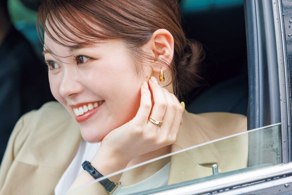ファーストブシュロンは、サプライズプロポーズで夫から贈ってもらったエンゲージリング。特にリクエストしたわけでなく、彼がいろいろ悩みながらも選んでくれた経緯があるので、今では夫婦にとって思い入れのある大切なブランドに。ラウンドダイヤモンドを囲むようにダイヤが施された華やかなリングを贈ってくれたので、ウェディングリングは日常でもつけやすく、重ねた時にエンゲージリングが引き立つようにとゴドロンを選びました。ドレッシーな装いはもちろん、スポーティやカジュアルな日に手元を華やかにするのも艶っぽさのバランスが取れて好きです。パーカにデニムにスニーカー、でも手元はブシュロン。そんなバランスも贅沢で可愛い!オシャレを楽しむ高揚感を与えてくれる特別なジュエリーです。