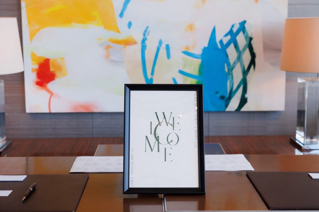 タペストリーだけでなく、招待状やメニュー表、席札に至るまで、すべてCanvaでデザインし、グリーンをキーカラーに統一。シンプルかつ洗練された仕上がりで、会場全体のトーンとも美しく調和しました。