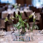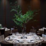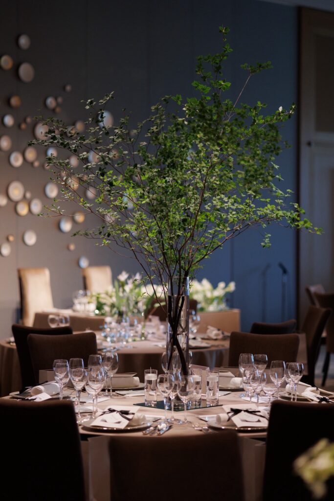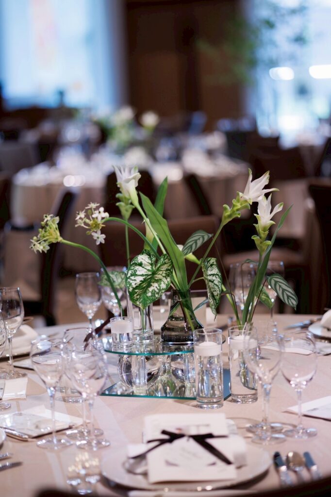 装飾のテーマカラーに選んだのは、落ち着きのあるグリーン。「ゴージャスすぎる空間ではなく、どこか抜け感のある、ナチュラルでモダンな雰囲気を目指しました」と語る舞さん。テーブル装花にはグリーンを基調にホワイトを織り交ぜ、空間全体を洗練された優しいトーンで統一。植物の自然な風合いが心地よく、スタイリッシュでありながらもリラックス感のある会場を演出しました。