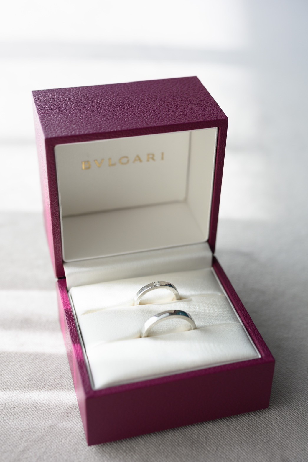 普段にも着けやすい「ブシュロン」の婚約指輪&結婚指輪は「ブルガリ」のシンプルなプラチナ