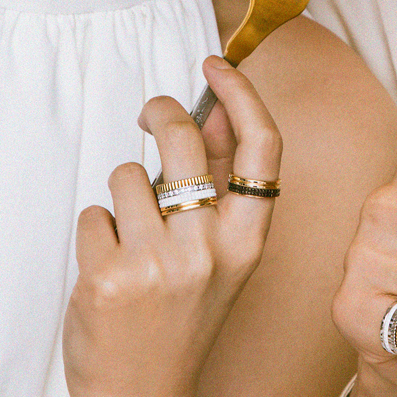 ダイヤモンドの国際基準4Cに加え、独自の厳しい基準を設けているカルティエのダイヤモンド。調和の取れた台座からエレガントに輝く、1世紀以上メゾンのシグネチャーであり続ける洗練されたフォルムに胸が高鳴る。リング上から「1895」〈Pt×Dセンター0.3ct〜〉¥743,160〜「エタンセル ドゥ カルティエ」〈YG×D〉¥792,000「C ドゥ カルティエ」〈PG×D〉¥342,100(すべてカルティエ/カルティエ カスタマー サービスセンター)キャップ¥4,840(ニューエラ × ジーンズ ファクトリー/ジーンズ ファクトリー 卸団地本店)ブラウス¥49,500(ビリティス・ディセッタン/ビリティス)