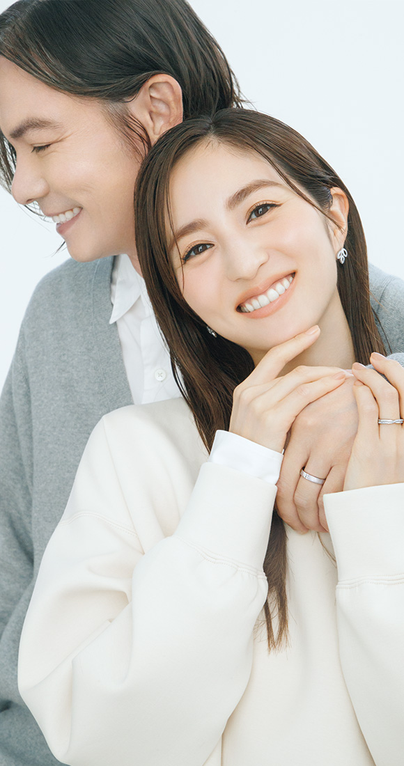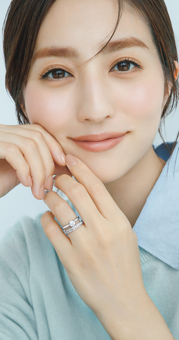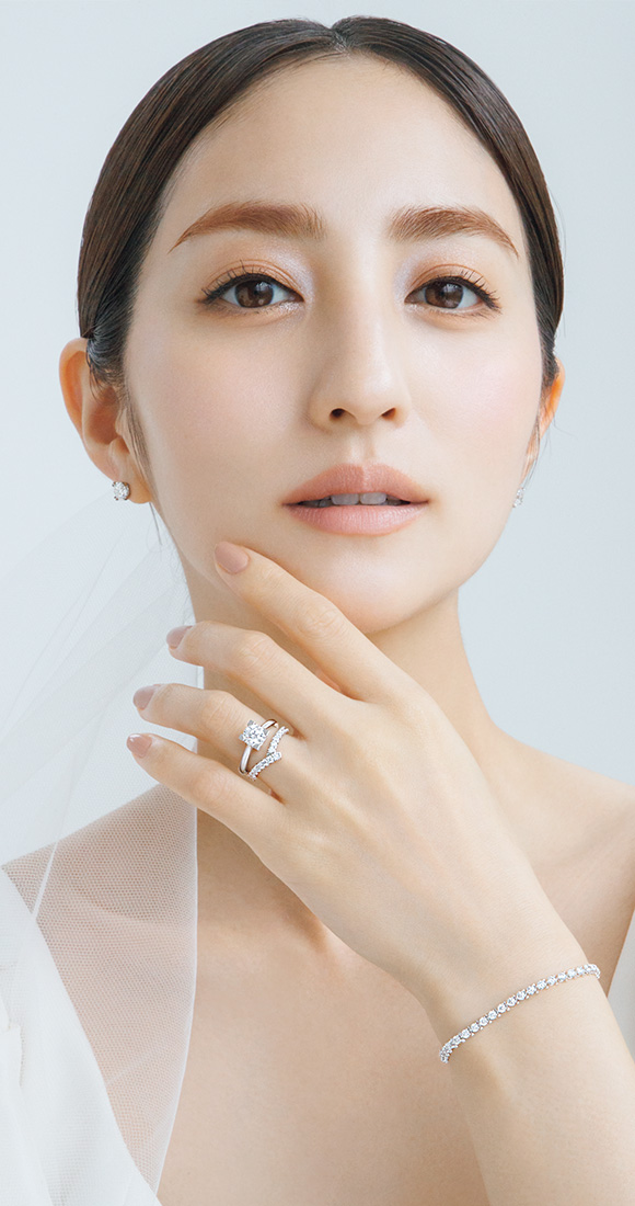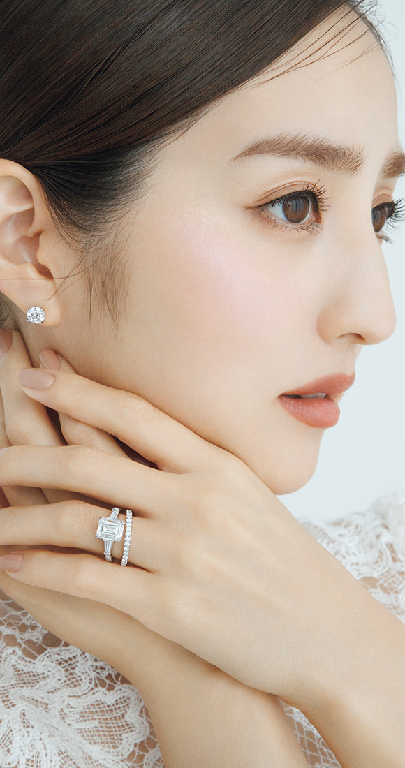 私にとって「ハリー・ウィンストン」は、ダイヤモンドの代名詞的存在。そして、できることなら大切な人から贈られたいジュエラーでした。実は夫にもさりげなくその思いを伝えていたのですが、そろそろかな…と思っていたプロポーズの際に、リングまで用意してくれていたことはうれしすぎるサプライズ。私がずっと憧れていた、絵に描いたような王道の立て爪デザイン「ラウンドカット・ソリティア・リング」――パーフェクトな選択に感動しました。マリッジリングは後日二人で選んだお揃いです。夫もダイヤモンド入りのリングを着けたいという希望があり、男性の手元にも違和感なくなじむことが大前提でした。いろいろ迷って、指に着けた瞬間に〝コレだね!〟となったのが「トラフィック・アクセント・バンドリング」。まるで私たちを待ってくれていたのかと思うような、不思議な感覚でした。「ハリー・ウィンストン」のサロンは、外観も店舗の中もうっとりするような特別な空間。夫が一人でエンゲージメントリングを選びに行った際も、あまりにも美しいダイヤモンドのきらめきを目にし、その瞬間に〝これだ〟と決めた、という話を聞いていました。私もサロンを訪れた時、ファンタジーのようなときめきで胸がいっぱいに。これからリングを選ぶカップルのみなさんも、ぜひ〝キング・オブ・ダイヤモンド〟としての風格が伝わってくる空間で、二人だけの運命のリングに出会ってほしいです。