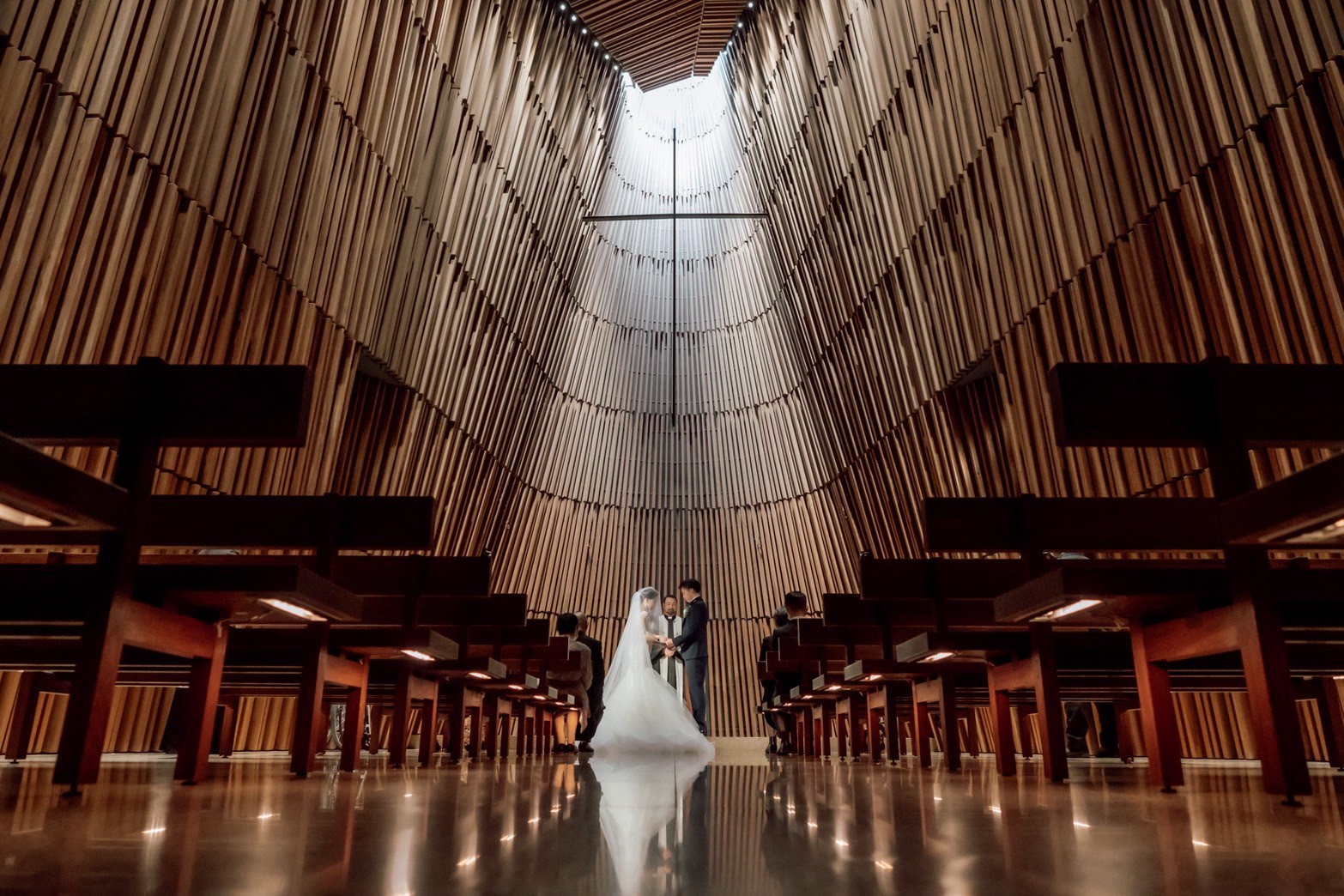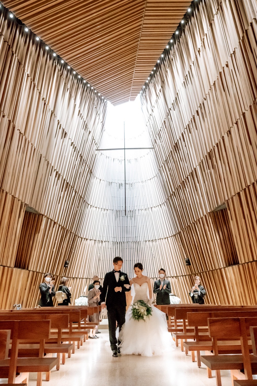 そして決め手となったのが、ホテル内のグランドチャペル。木の温もりに包まれた高天井の空間に、上階から生演奏が降り注ぐように響く幻想的な演出が印象的だったそう。
