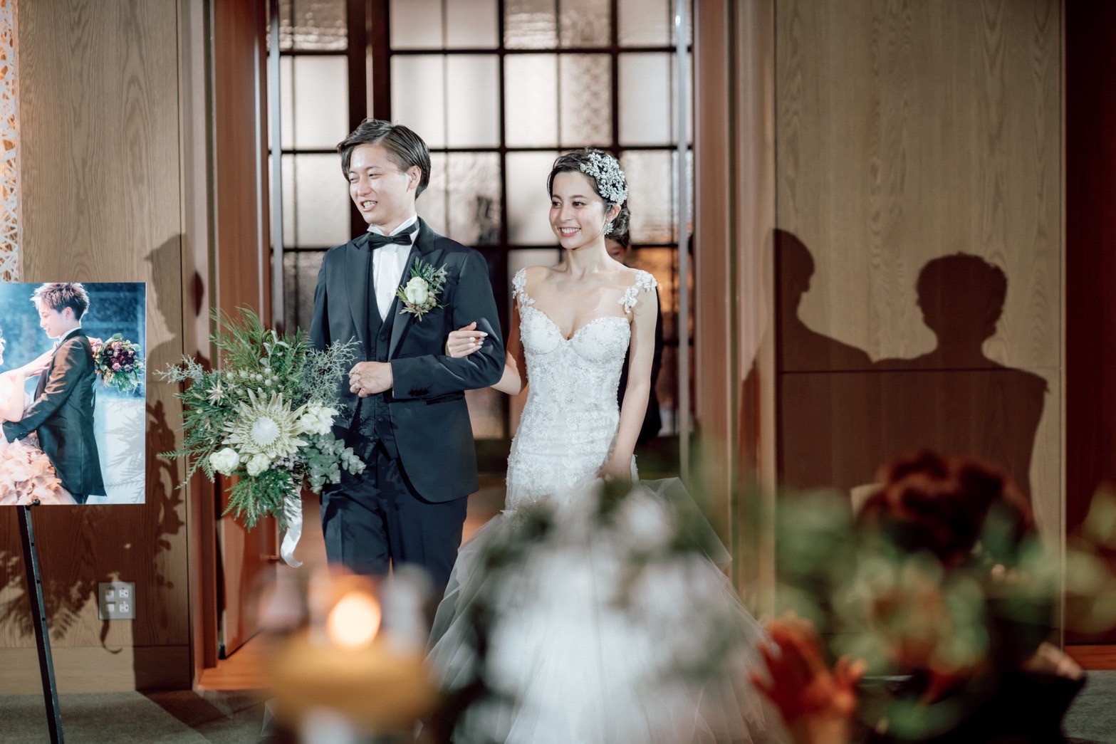 「当初は白とベージュを基調としたクラシカルな装花をイメージしていたものの、『久しぶりの家族団欒が心地よくなる空間を大事にしよう』と考え直し、ソファ席ではなくしっかりと食事を楽しめるテーブルスタイルに変更。ホテルウェディングでありながらも心が通うアットホームな空間を完成させました」(七海さん)