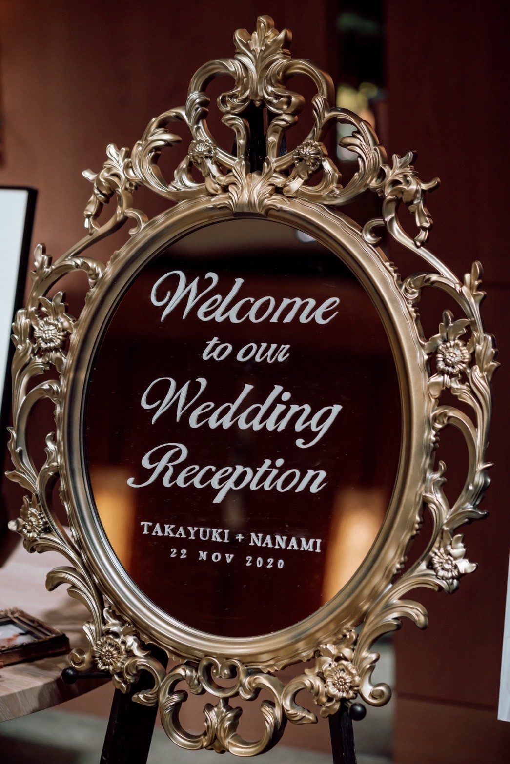 さらに印象的だったのが、ふたりで夜な夜な手作りした「ウェルカムミラー」。人気で入手困難なミラーをなんとか手に入れ、水彩絵具やポスカで仕上げたという愛情たっぷりのDIYアイテムです。