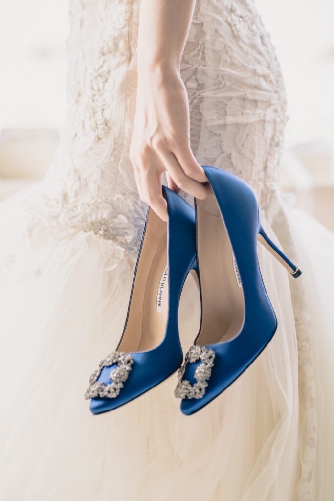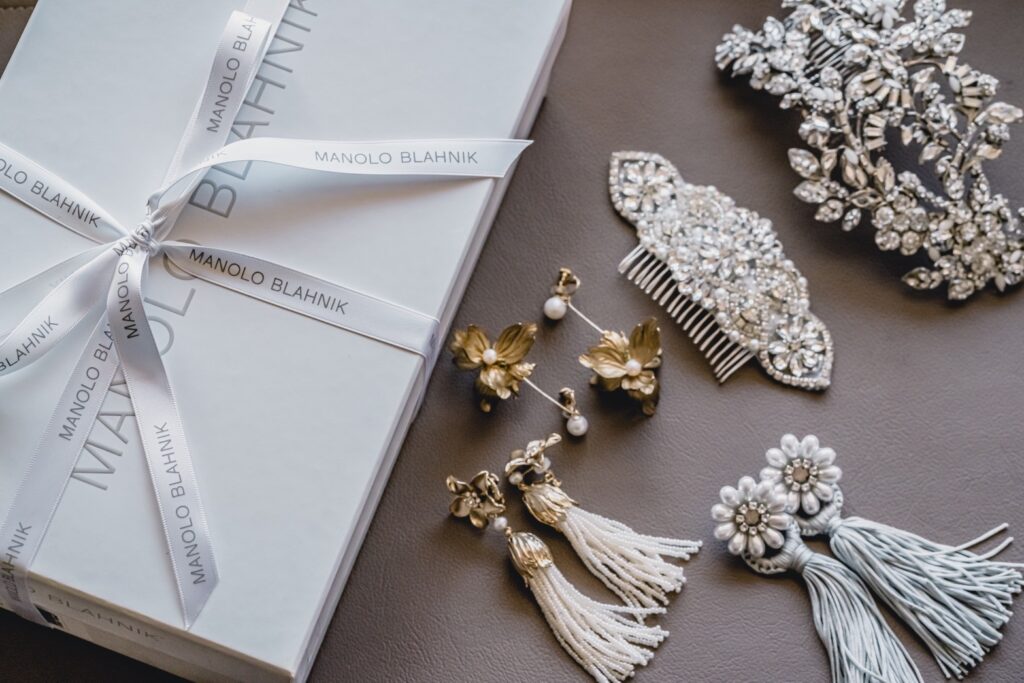 ヘッドアクセサリーは、Maria Elena(マリア・エレナ)の華やかなビジュータイプをセレクト。ブライダルアクセサリー専門の「𝐉𝐔𝐋𝐈𝐄𝐁𝐑𝐈𝐃𝐀𝐋」でレンタルし、お団子ヘア全体にかかるようにセットしてドレスの刺繍とリンクさせました。
