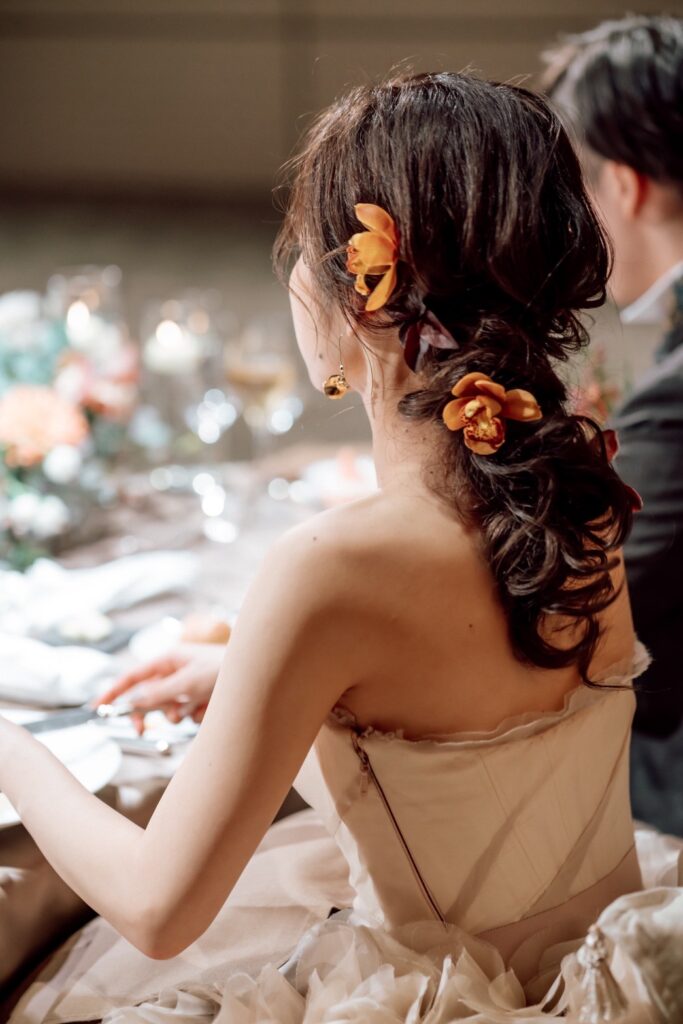 「生花を添えたい気持ちはあったけど、どんな花が入るかわからなかったので、当日に決めようと。ヘアメークさんが“崩したほうが可愛いかも”と言ってくれて、その場で完成しました。すごくお気に入りです」(七海さん)
