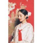 白無垢は「ハツコ エンドウ」オリジナルの「白枝垂桜飛鶴文(しろ しだれざくら とびづる もん)」。赤い重ね衿と赤い房の懐剣を合わせ、モダンなコーディネートに。