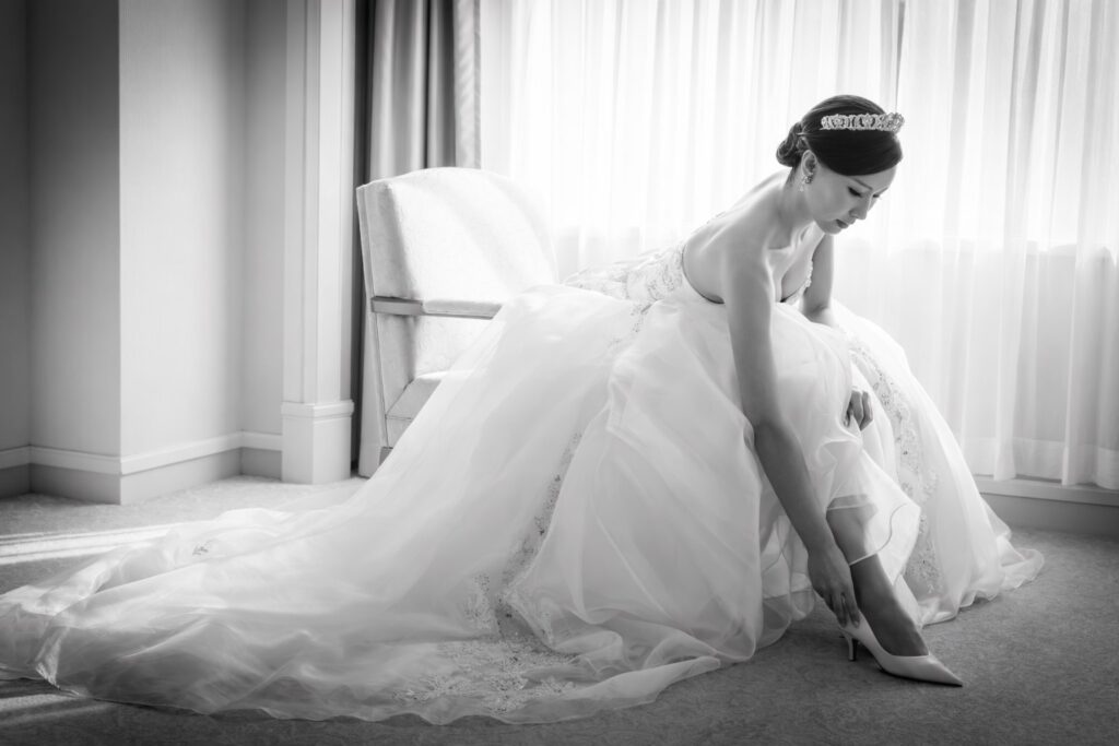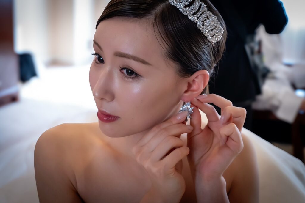 挙式時は、シンプルなアップスタイルにティアラを合わせて華やかに。お色直しでは髪を下ろし、メイクもリップを赤にするなど、印象をガラリと変えました。