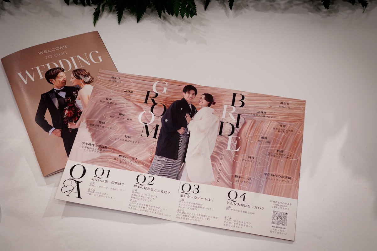 招待状や席札、プロフィールブックなどのペーパーアイテムは、すべて手作り。