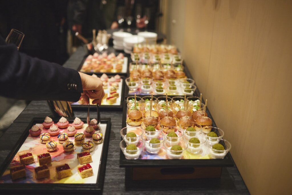 「受付〜挙式、挙式〜披露宴の間って、どうしてもそれぞれ20分ほど空白の時間が生まれるんですよね。ゲストも私たちも結婚式に慣れていないからこそ、“その時間をどう過ごしてもらうか”を考えた結果、ピンチョスと甘いもの、お酒を用意することにしました」(由佳さん)