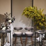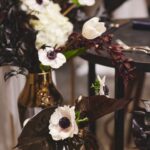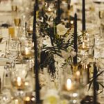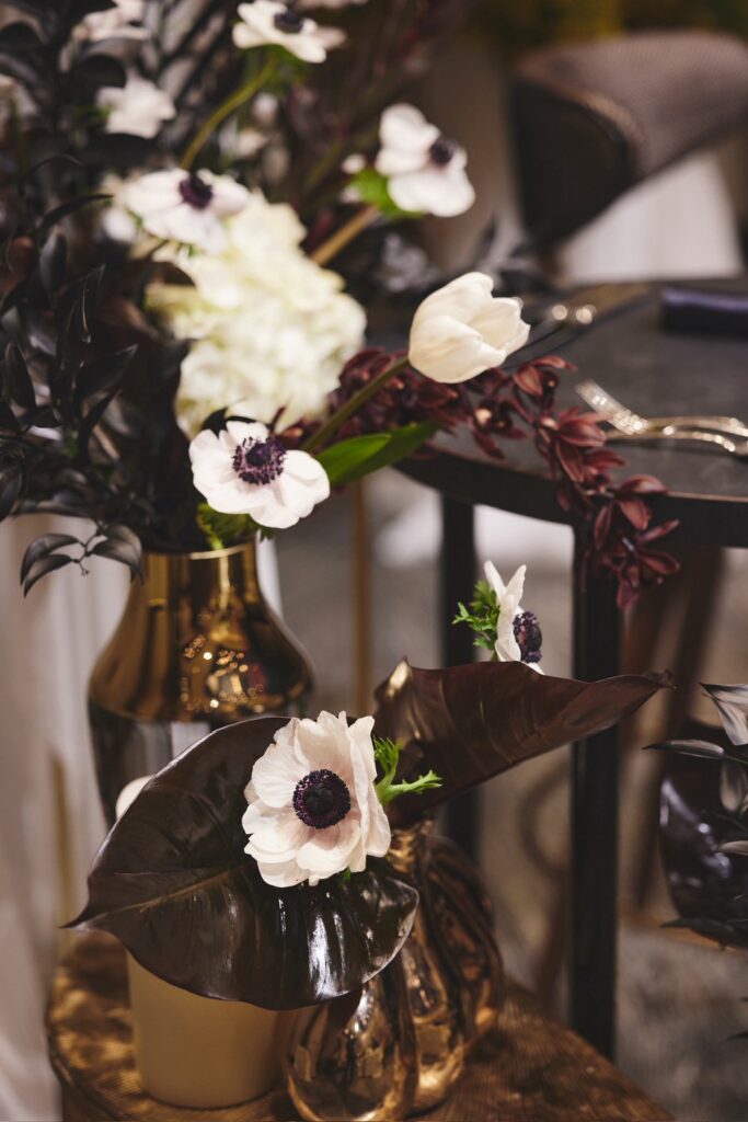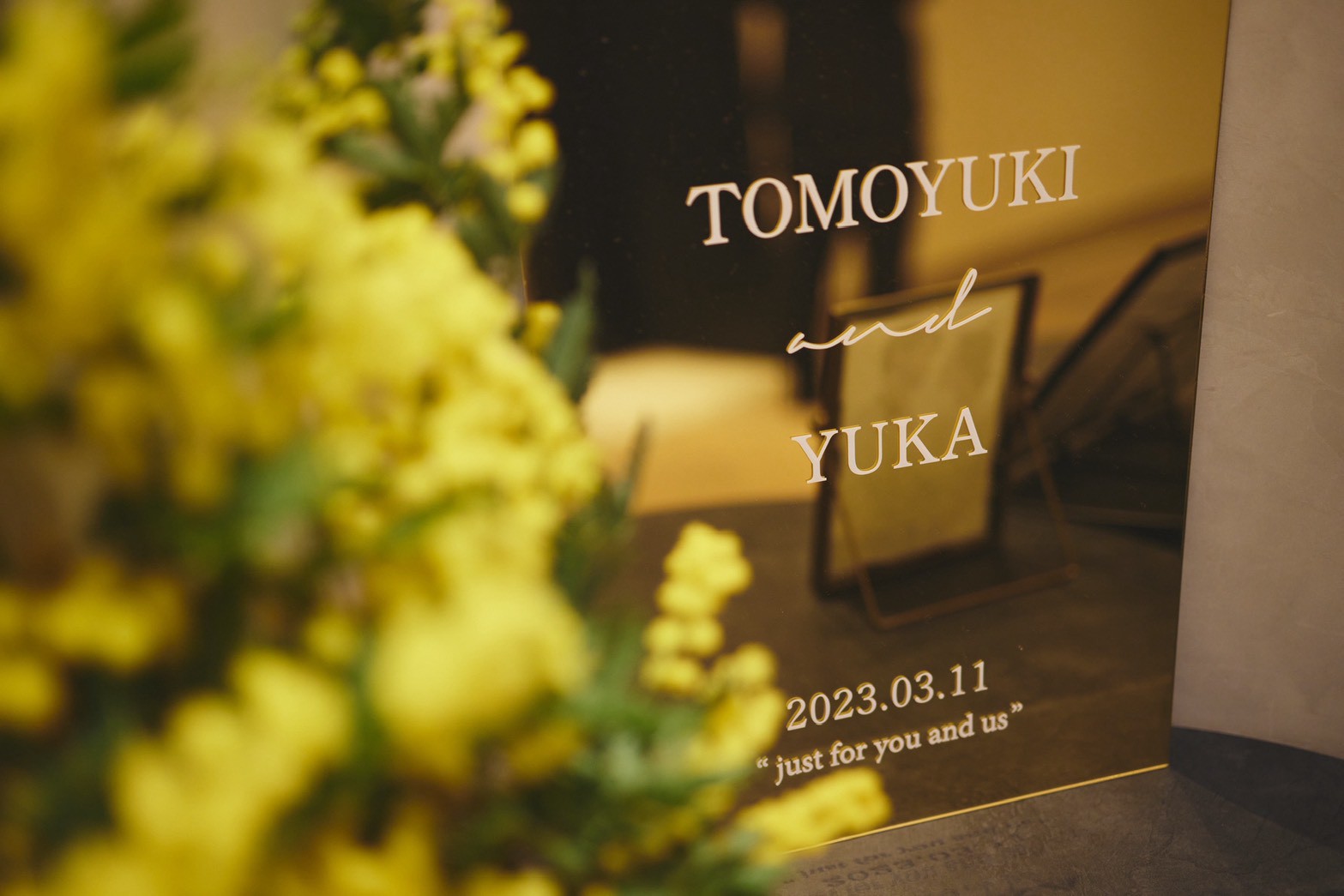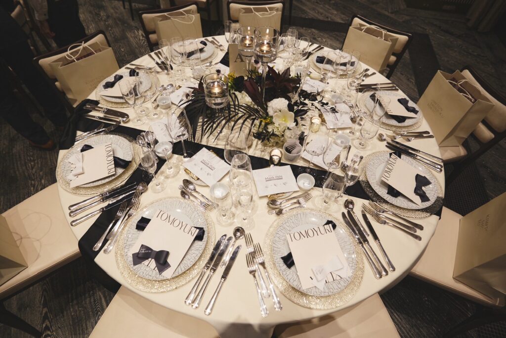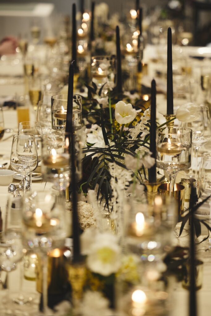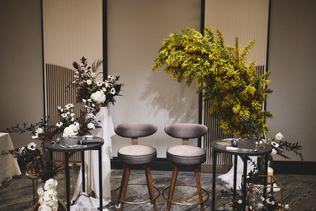 「高砂の後ろにミモザのツリーを置いて、そこをメインにしました。ミモザの黄色を引き立たせるために、他のお花やテーブル装飾は白と黒のモノトーンに、少しゴールドを効かせる程度に抑えました。フローリストさんと相談しながら“少し個性を入れてみよう”と黒を入れたら、空間がぐっと締まってすごく良いバランスになりました」(由佳さん)