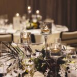 披露宴会場は、ミモザを主役にしたモノトーンコーディネート