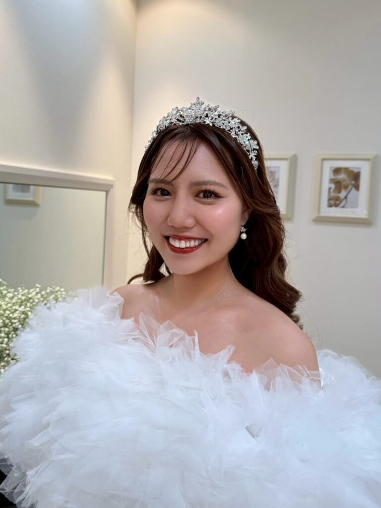 挙式では、アップヘアにすっきりとした胸元を活かしたミニマルなスタイル。一方、披露宴ではティアラを合わせてダウンスタイルにチェンジし、さらにボレロを重ねることで、華やかな印象へとシフトさせました。