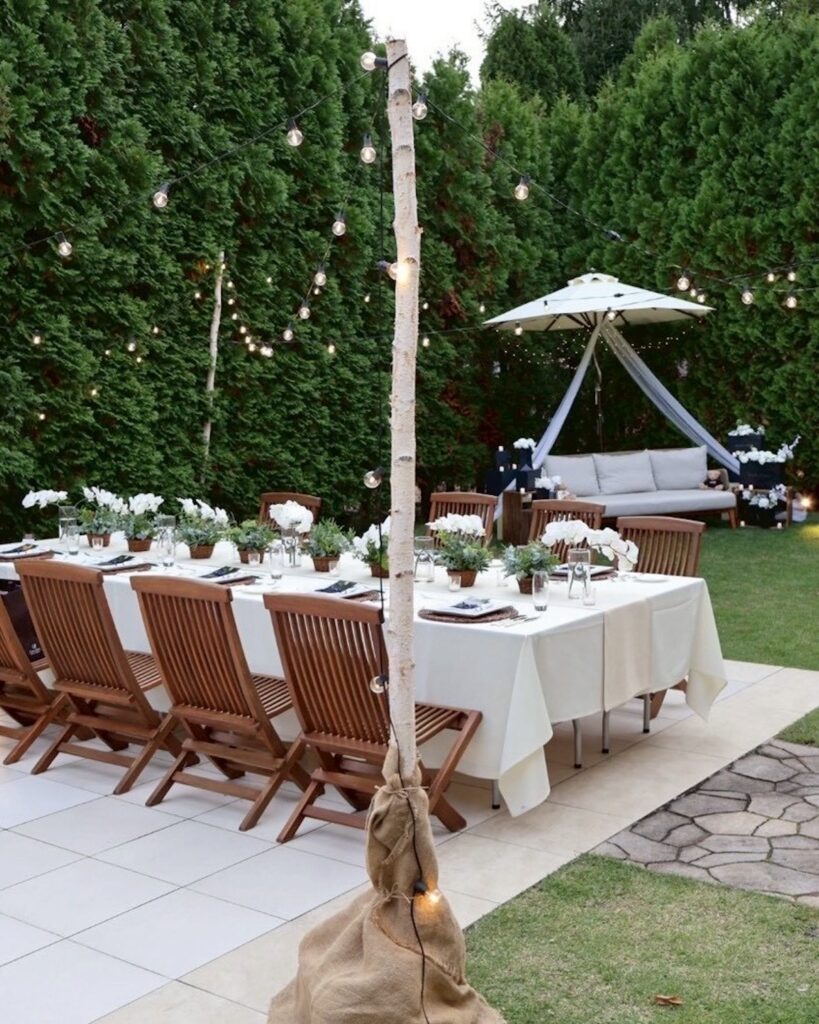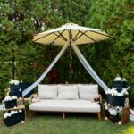 披露宴はガーデンで行うことを希望。前例がないと言われながらもプランナーさんと相談し、実現しました。テーブルの配置も「背景はグリーンの木にしたい」と直前まで調整し、理想のレイアウトに。フォトブースは会場の備品(パラソルやソファ)を組み合わせてDIY。当日は快晴に恵まれ、ガーデンの芝生も乾いたベストコンディションに。