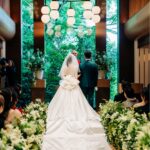 さらに、新郎のグリーンのタキシードに合わせて、装花にもグリーンをプラス。色の掛け合わせで、甘くなりすぎないバランスに仕上げています。さらに、見た目の華やかさだけでなく、写真にどう写るかも重要なポイントに。