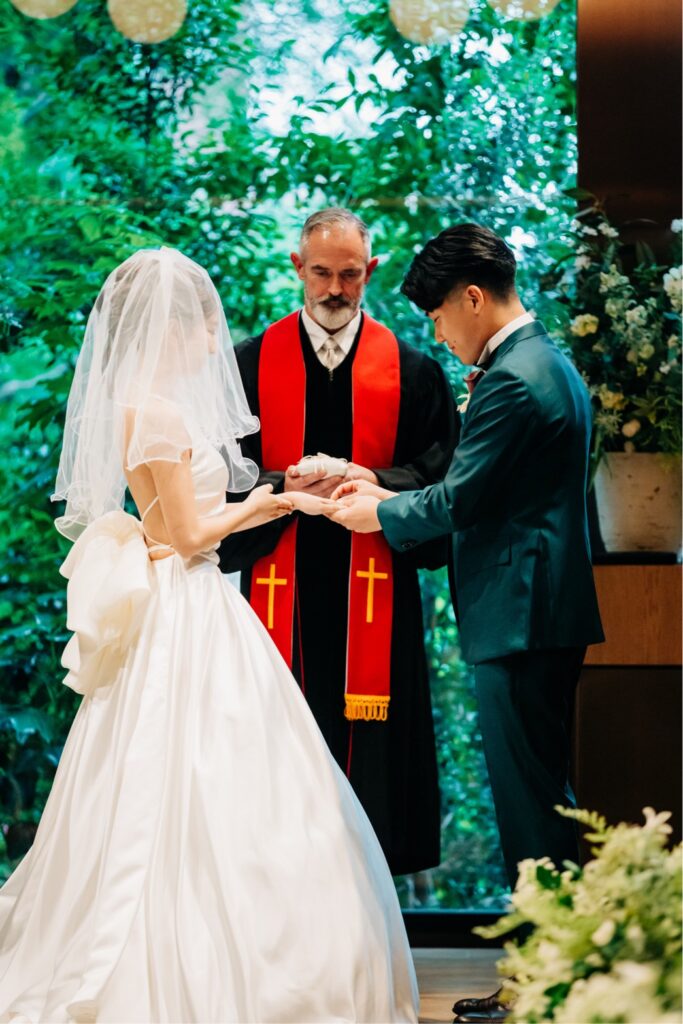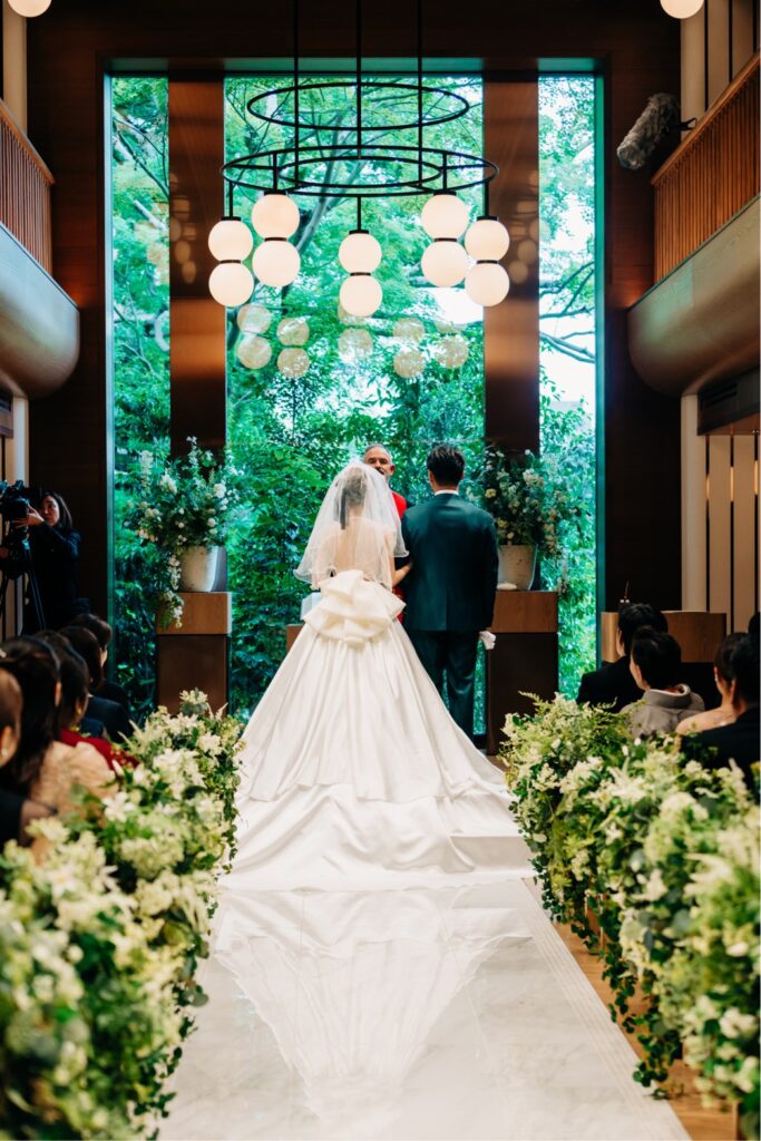 挙式会場に選んだのは、庭園内に佇む独立型チャペル「ヴァンヴェール」。天井高のある空間に、上階から生演奏が降り注ぐように響く、印象的な会場です。
