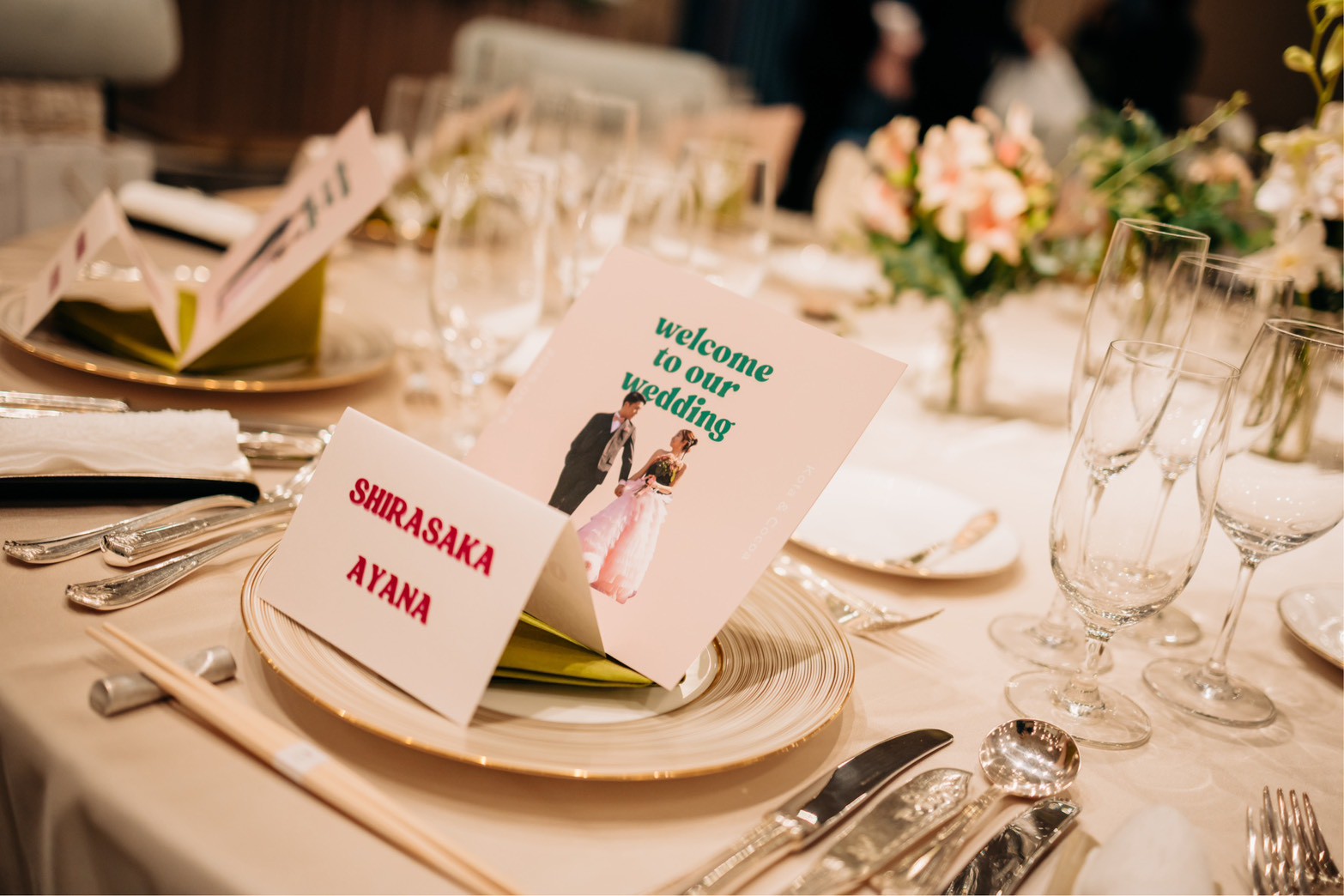 「Canvaで作りました。席札には、ウェルカムボードで描いてもらったイラストを使っています」(心愛さん)