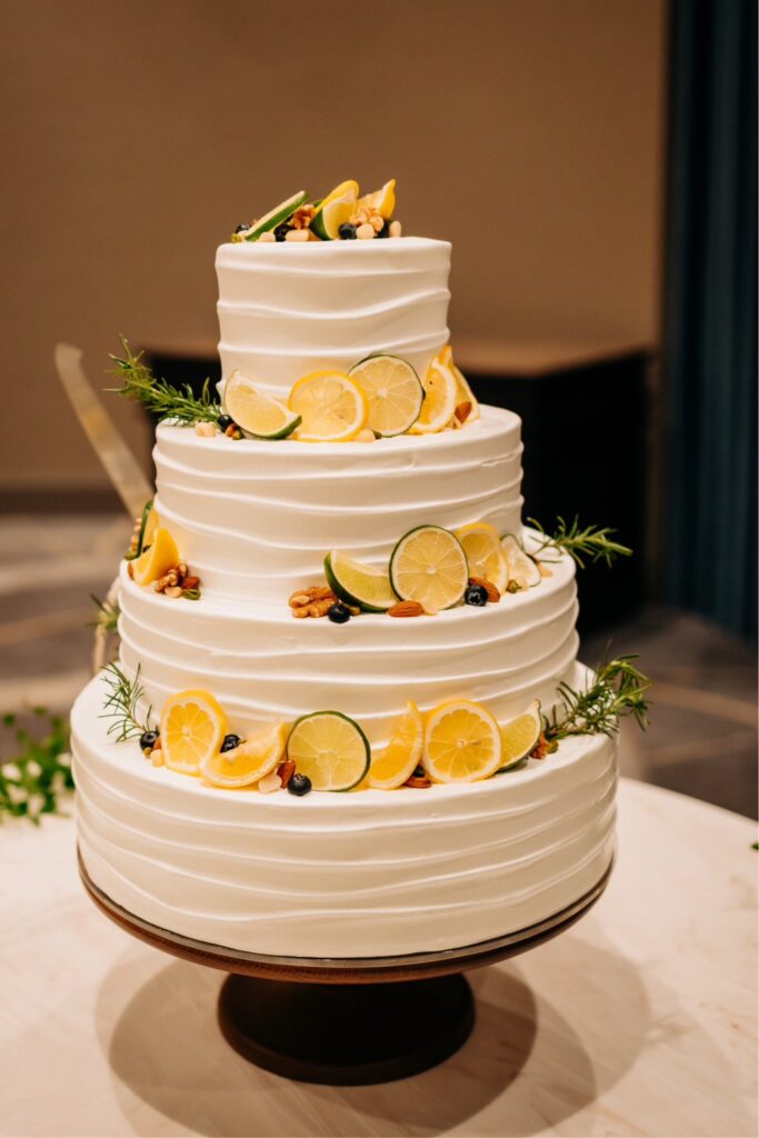 ウェディングケーキは、レモンが主役のトロピカルデザイン