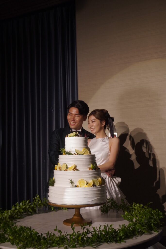 ウェディングケーキは、レモンがのったトロピカルで明るいデザインをセレクト。ふたりの「海が好き」「明るい雰囲気が好き」という個性がそのまま反映された一台になりました。