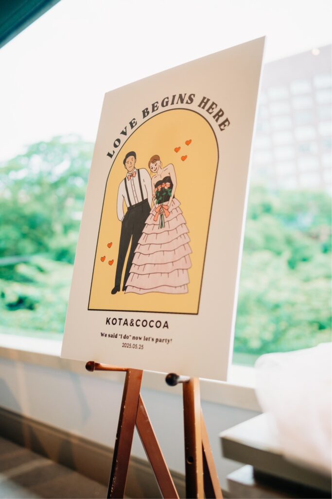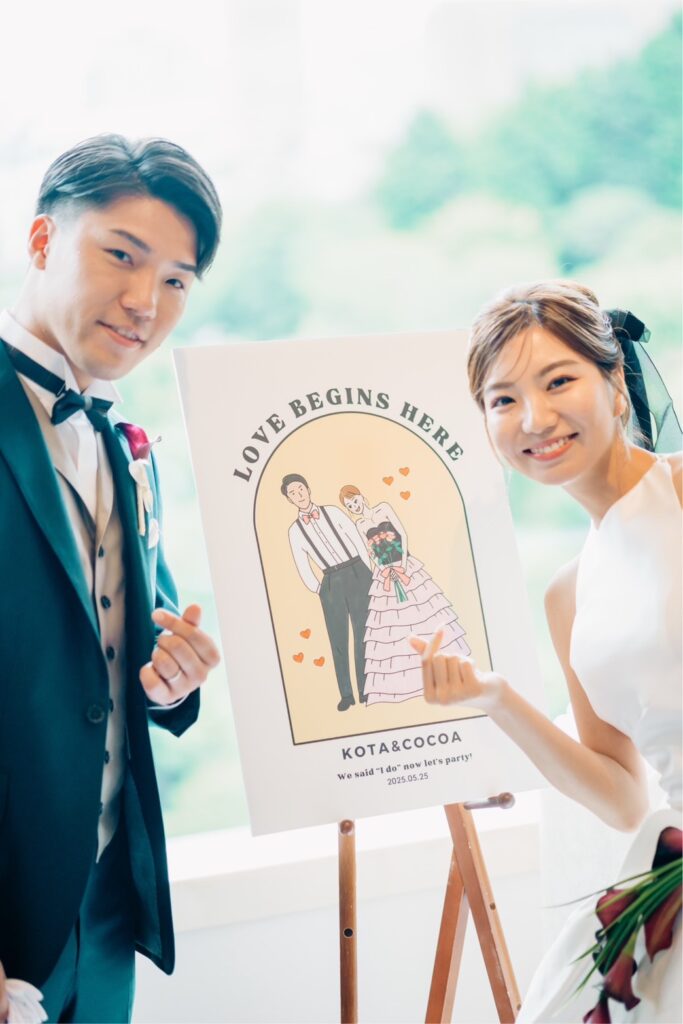 「前撮りの写真を飾るのが少し恥ずかしくて(笑)。絵が上手な友人がいたので、お願いして似顔絵を描いてもらったんです。自分たちらしさが出て、すごく気に入っています」(心愛さん)