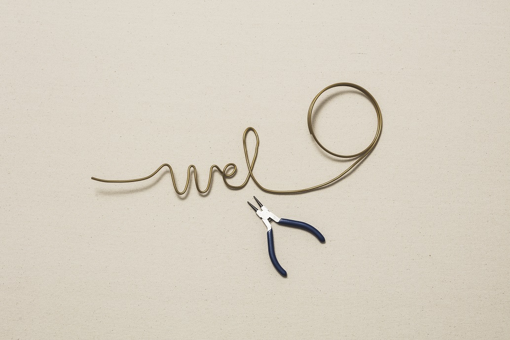 2.印刷したメッセージに合わせて、丸ペンチでワイヤーを曲げる。