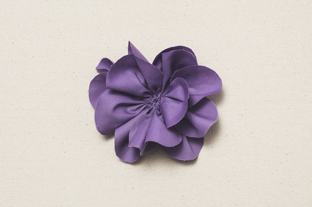3.2の端まで糸を絞り、花弁になるように形を整える。あと2つも同様にする。