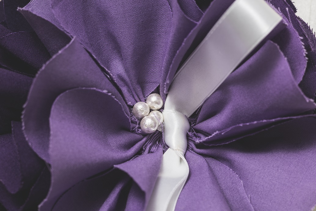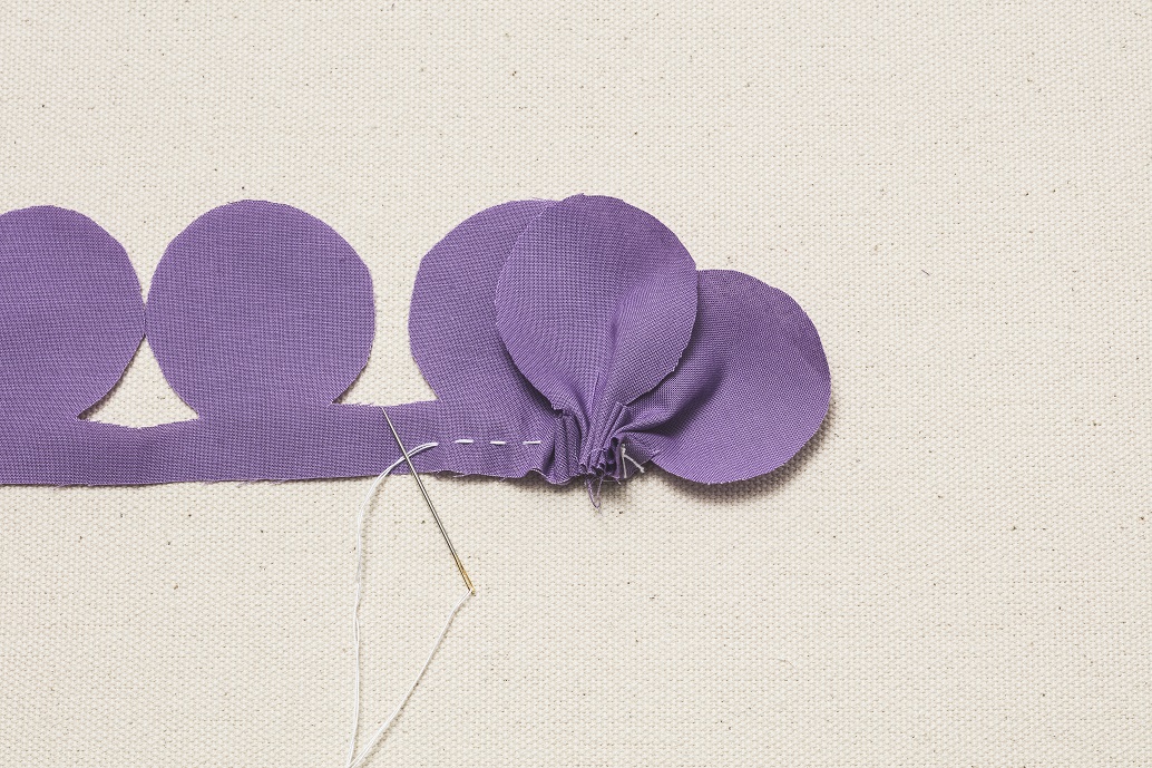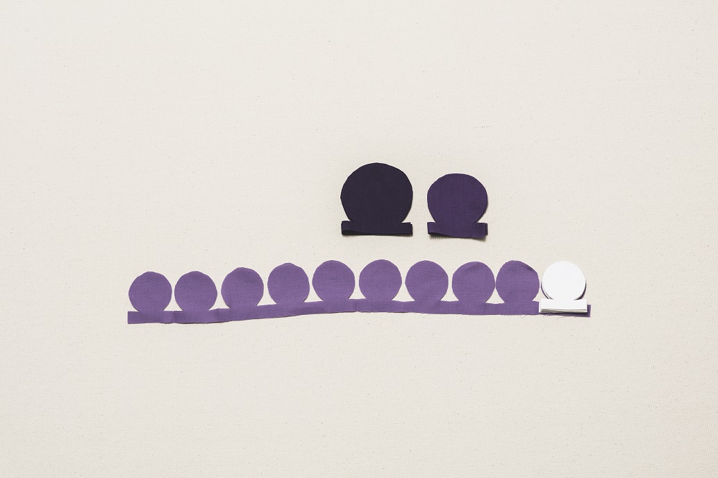 1.パープルの布地をΩが連なる形に切る。グラデーションになるように、色と大きさ違いであと2つ切る。