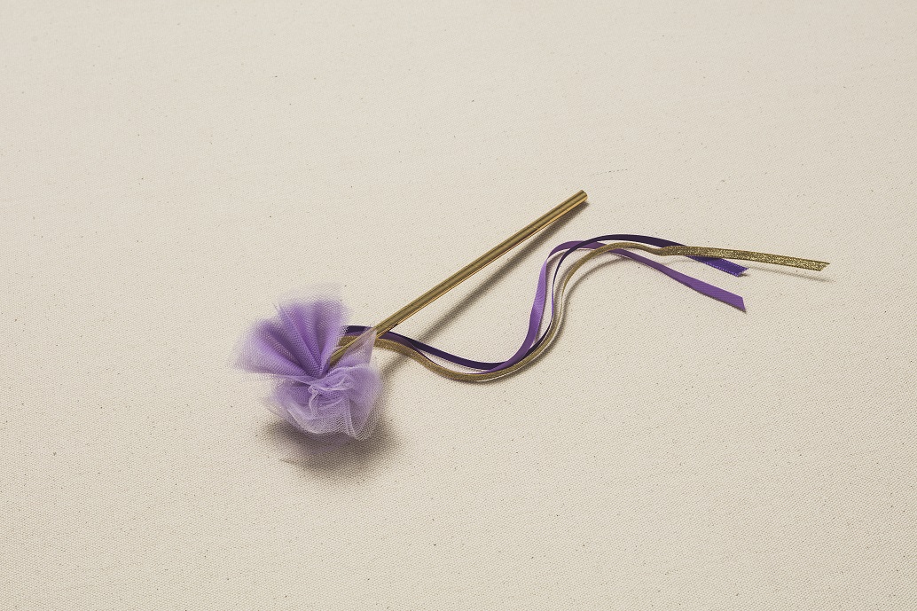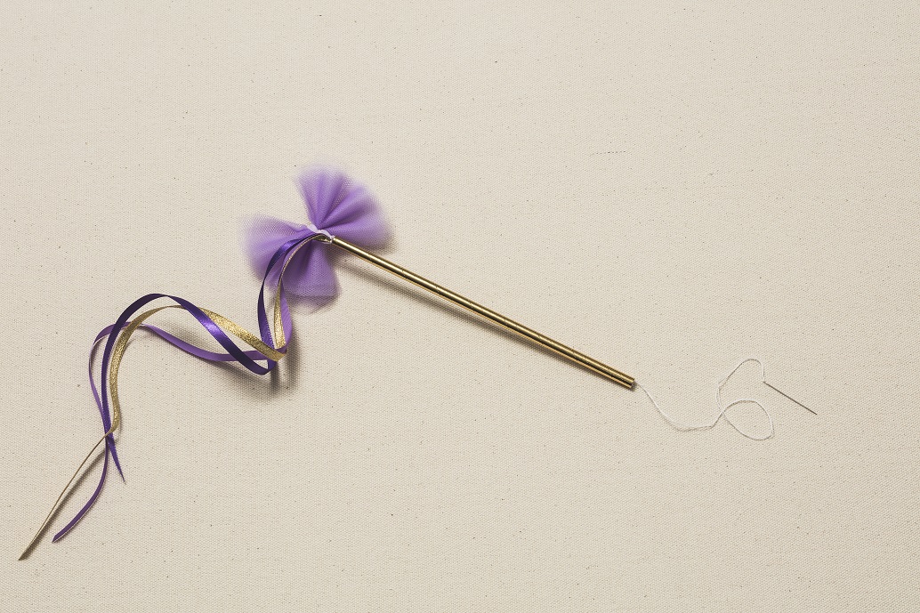 4.3のリボンの端に針で糸を通し、フォトサインのプロセス3~4の要領でチュール部分をストローに固定する。このとき、リボンの端はストローの中にしっかりと入れる。