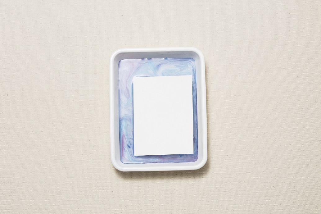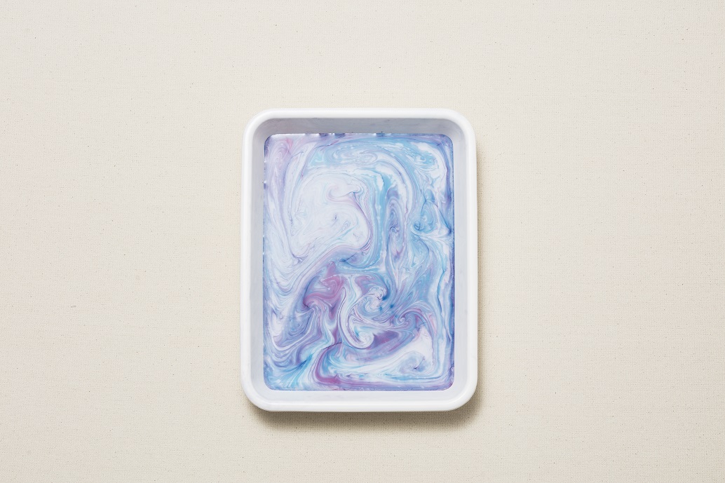 1.水を張ったバットにアクリル絵具を2色ほど垂らし、竹串などで水面をそっと混ぜ、マーブル模様を作る。