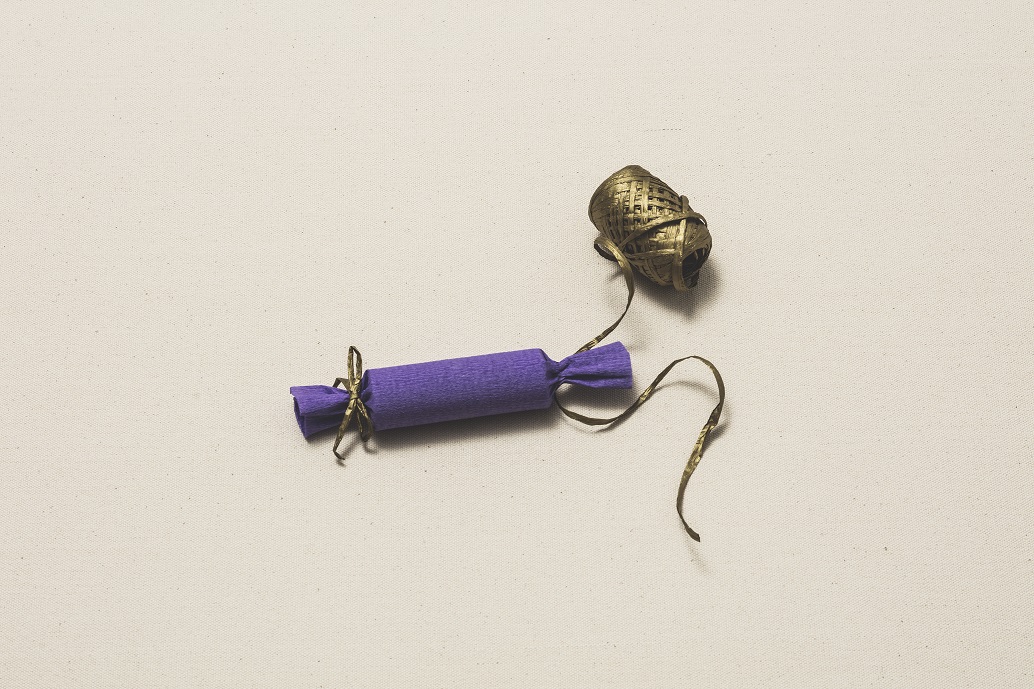2.1の紙の両端を紐で結び、キャンディ包みにする。中央に好きなメッセージを入れたトレーシングペーパーを貼る。