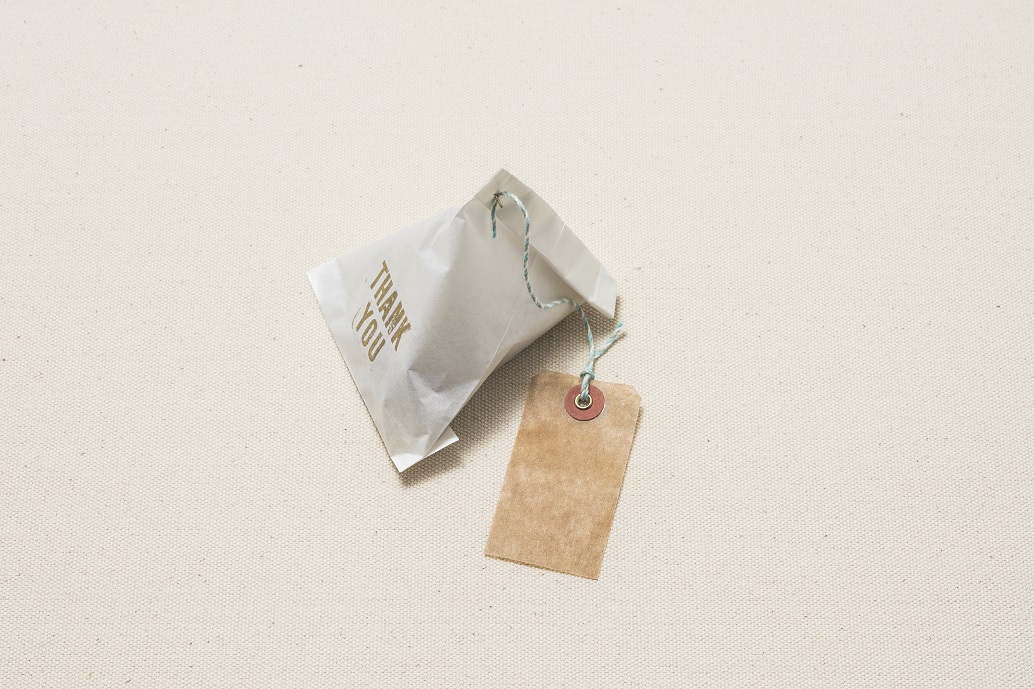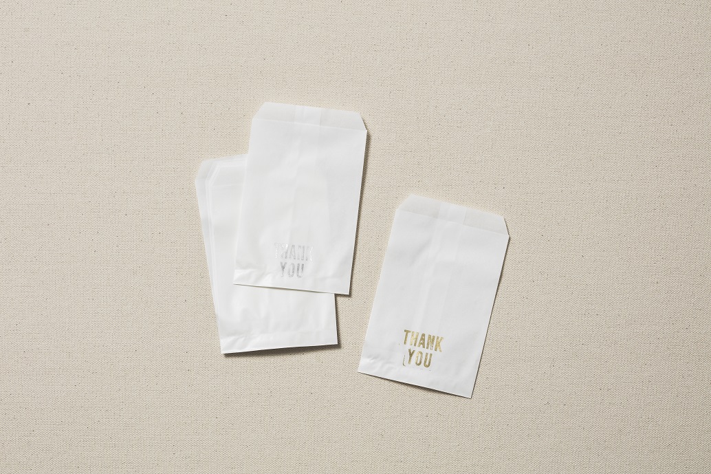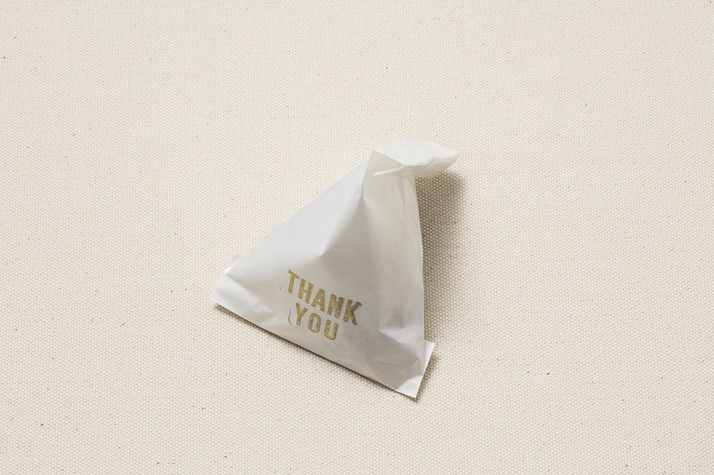 2.1の紙袋にプチギフトを入れ、口の両端を合わせて2回折り、テトラ型にする。