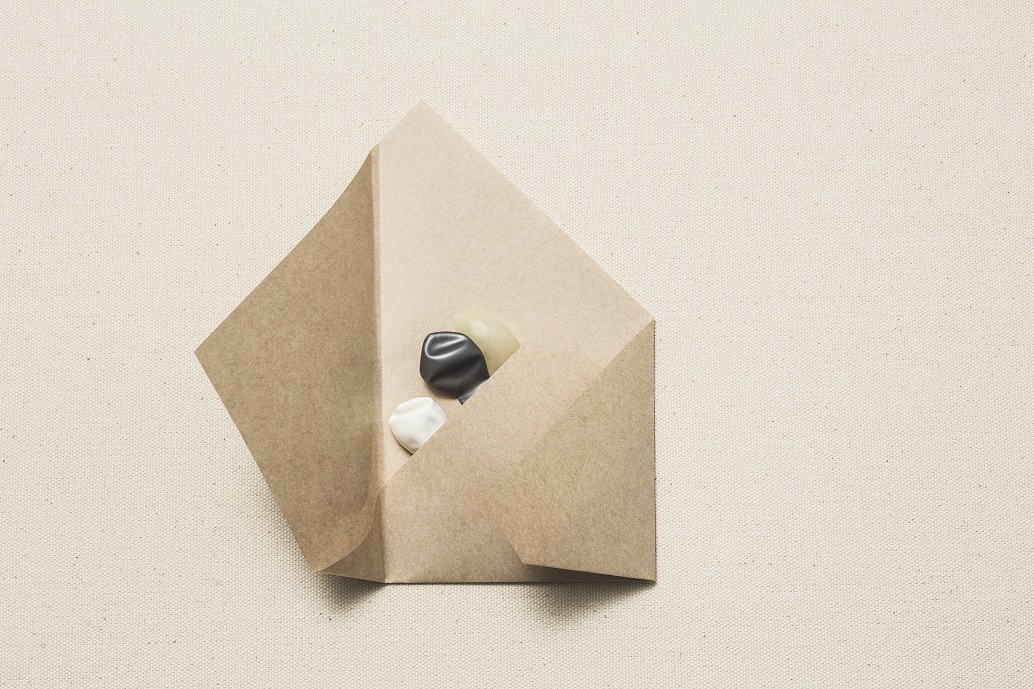 1.クリアカラー・白・グレーのミニバルーンを紙の上に置き、写真のように下の角を折り上げる。