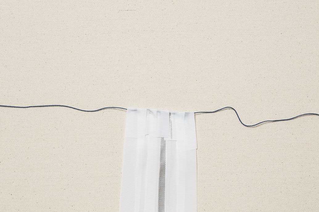 4.紐をはさむようにして白いリボンの端を折り返し、グルーガンで留める。白いリボンを少しずつ重ねて留めていき、数本ごとに銀のリボンを混ぜる。このとき、リボンの表は、グルーガンで留めた面の反対になるように注意。