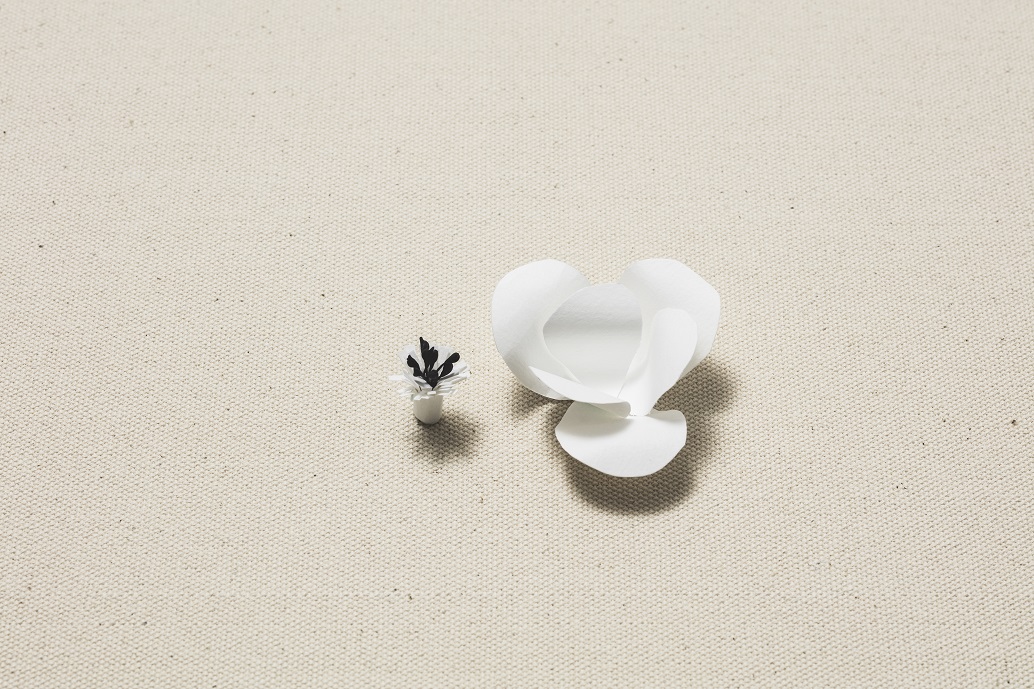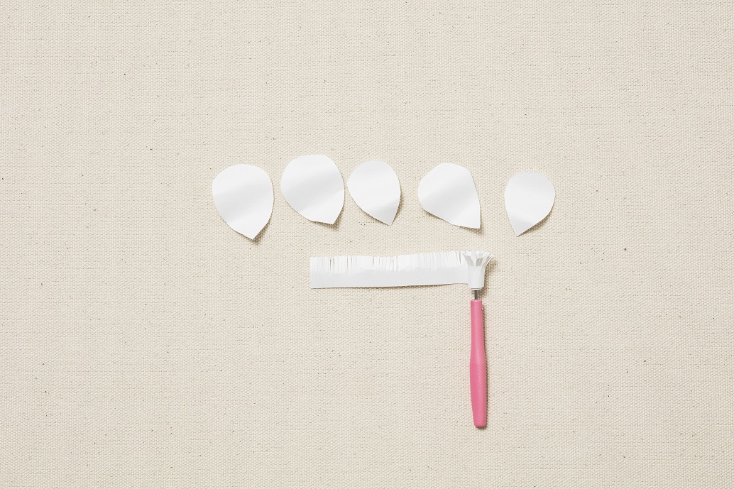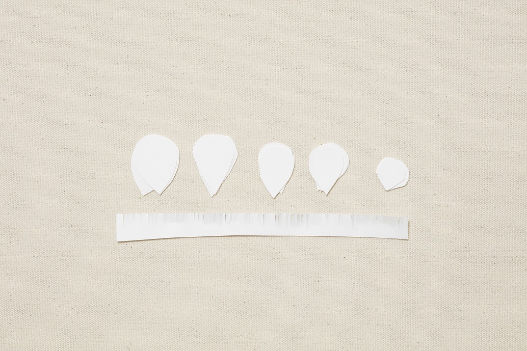 1.ペーパーフラワーを作る。まず、紙を花びら形と長方形に切る。花びらは、作りたいペーパーフラワーの大きさに合わせてサイズ違いに切る。きっちりと形を整えずに、フリーハンドで切ったほうが、ニュアンスが生まれて自然な仕上がりに。また、枚数を増やせば花弁部分にボリュームが出る。長方形の紙には細かい切り込みを入れる。