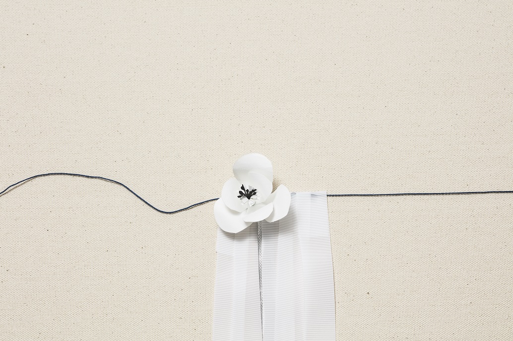 5.グル―ガンを使い、リボンの表面上部に3のペーパーフラワーを留める。