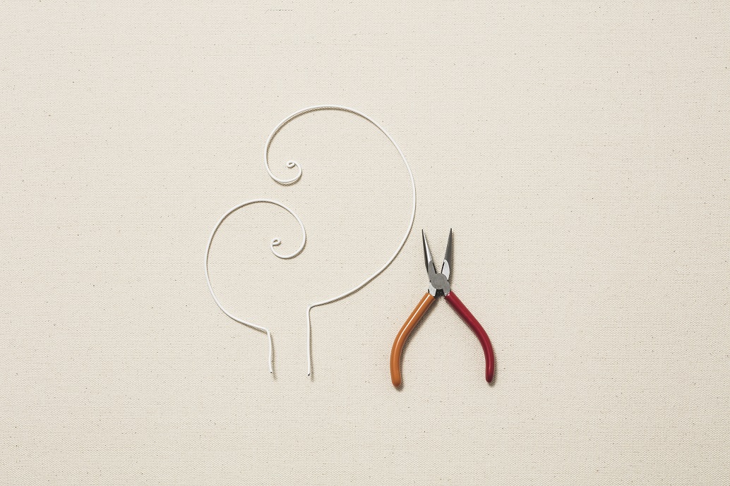 2.固めのワイヤー(※)の先端を3㎝ほど残し、丸ペンチで写真のように曲げたパーツを大小サイズ違いで2つ作る。