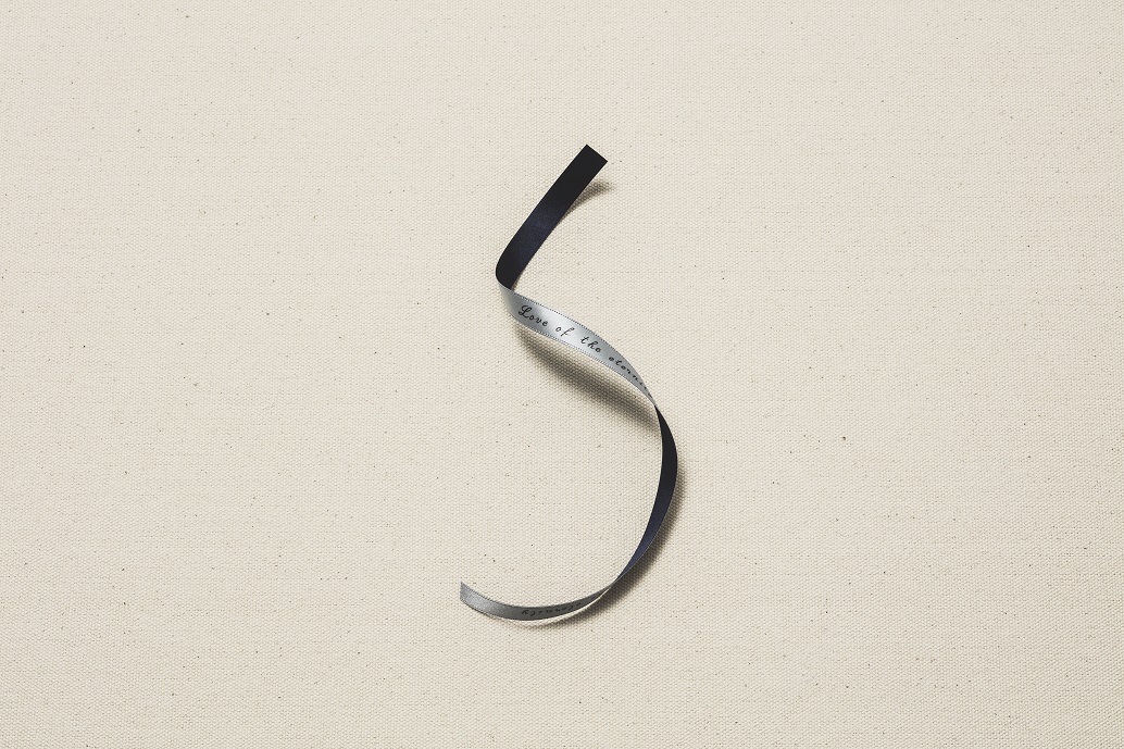 1.リボンに好きなメッセージを入れる。写真では「テプラ」で専用リボンに印刷。手書きやスタンプでもOK。