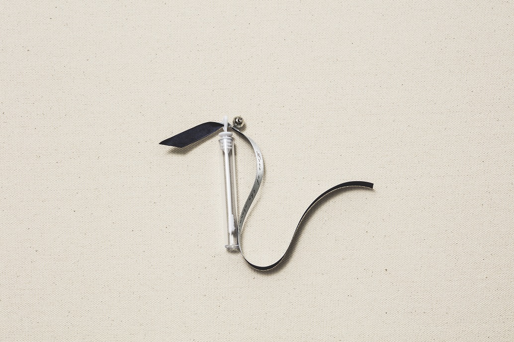 2.1のリボンに鈴を通し、シャボン玉容器に結ぶ。容器にシャボン玉液を入れて、しっかり蓋を閉める。