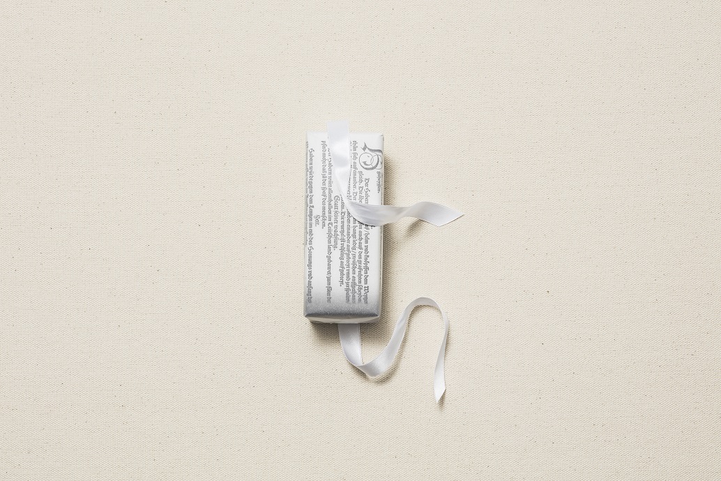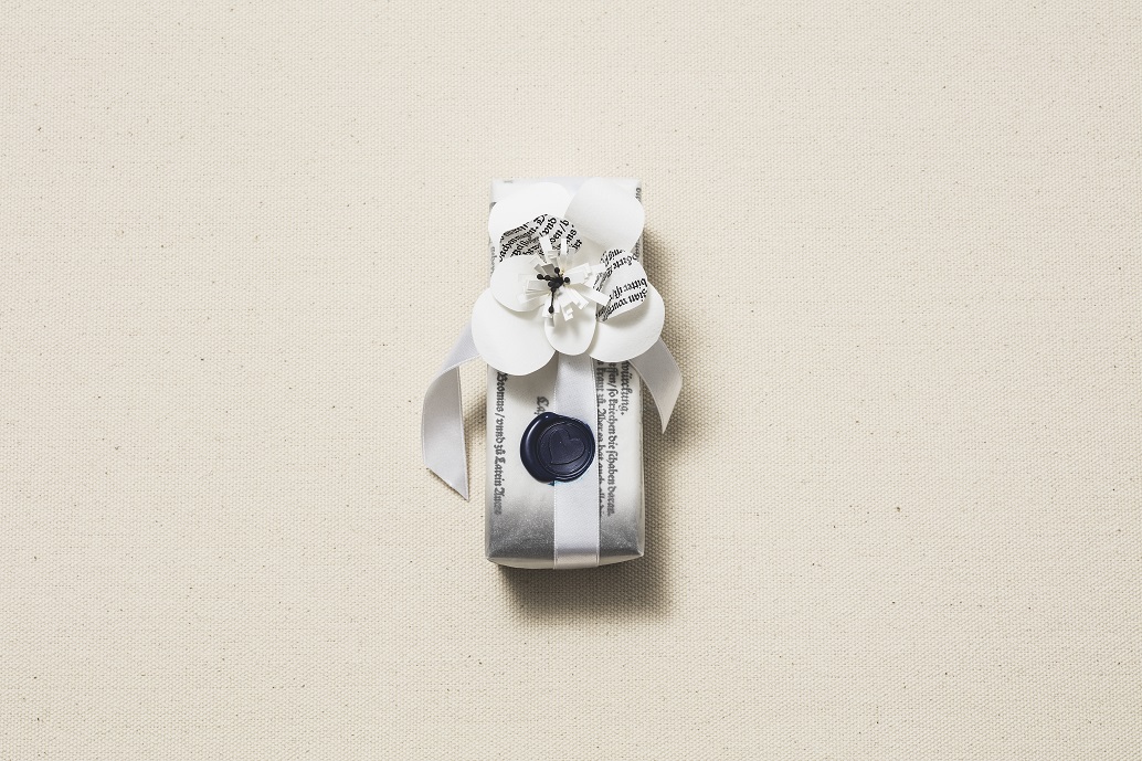 2.プチギフトの箱を1でキャラメル包みにする。トレーシングペーパーを重ねて包み、リボンを巻く。