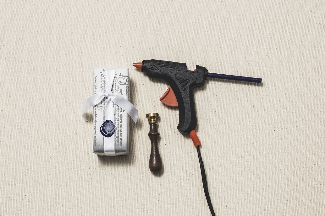 3.2の巻いたリボンにグルーガンで好きな色のワックスを丸く垂らし、シーリングスタンプを押す。